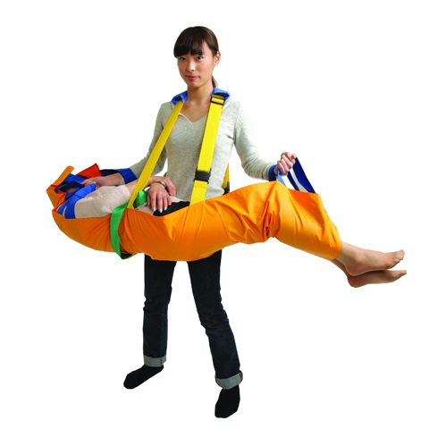 軽量でコンパクトに収納可能。緊急時に一人で担げる担架です。通常は二人です。